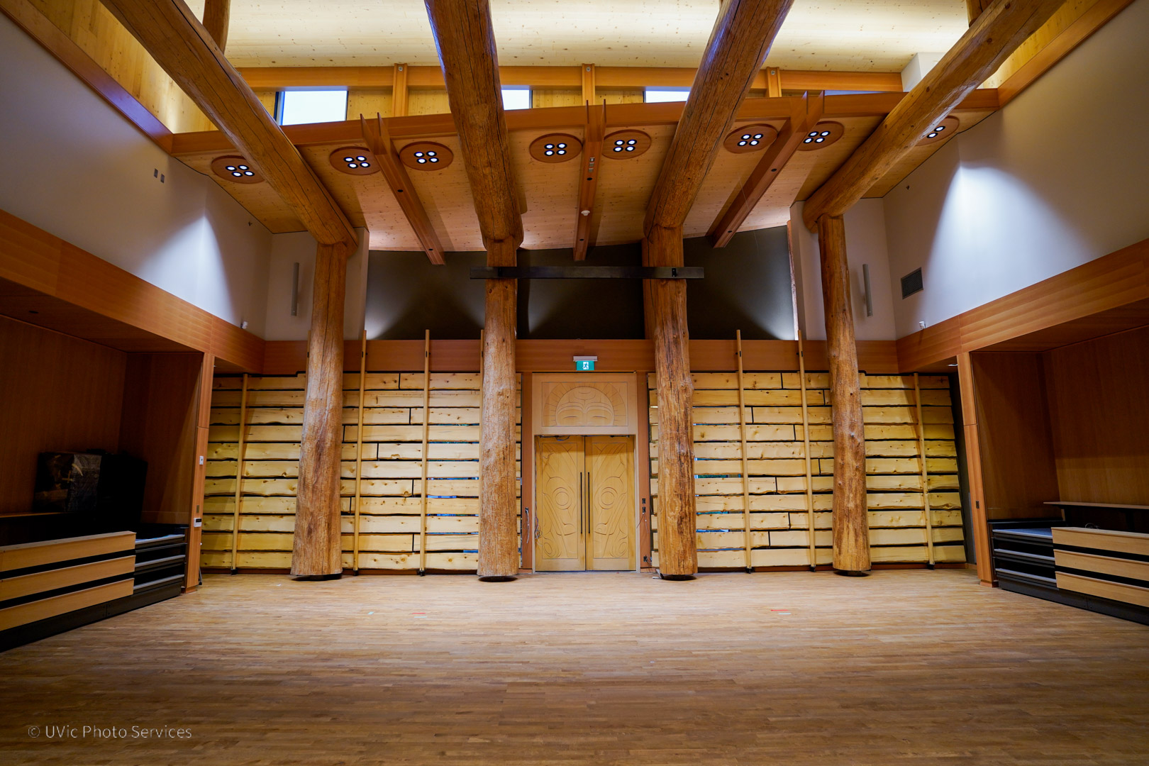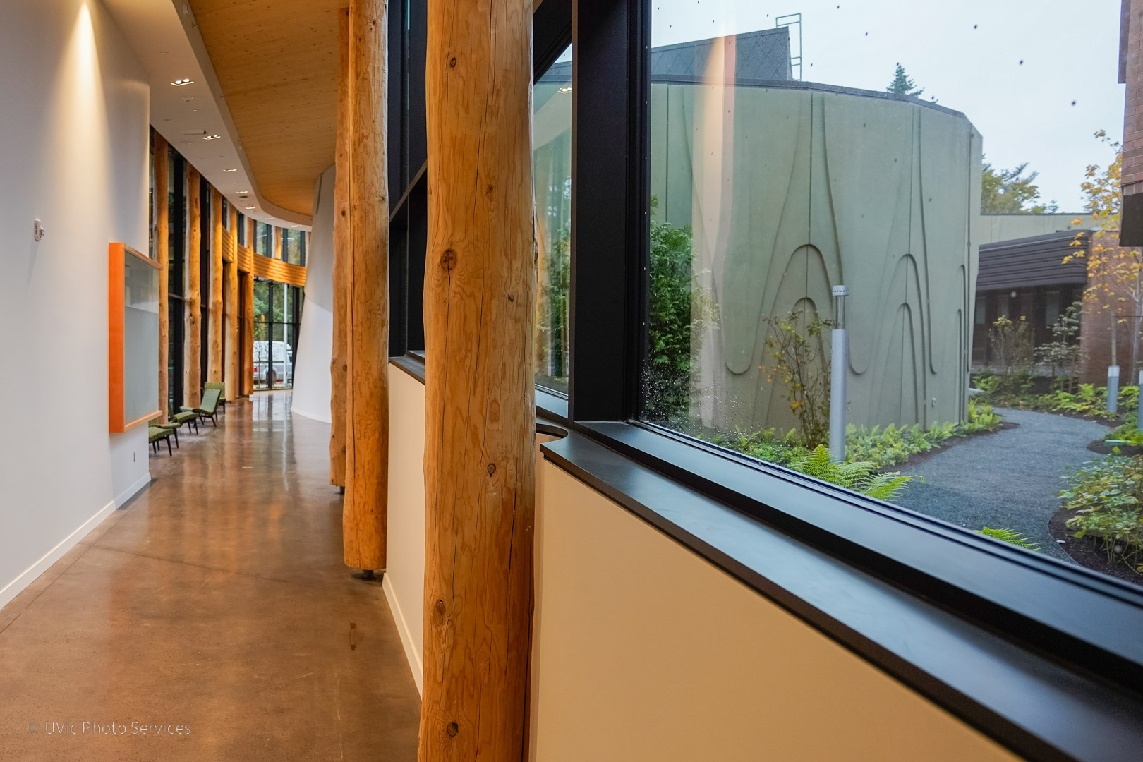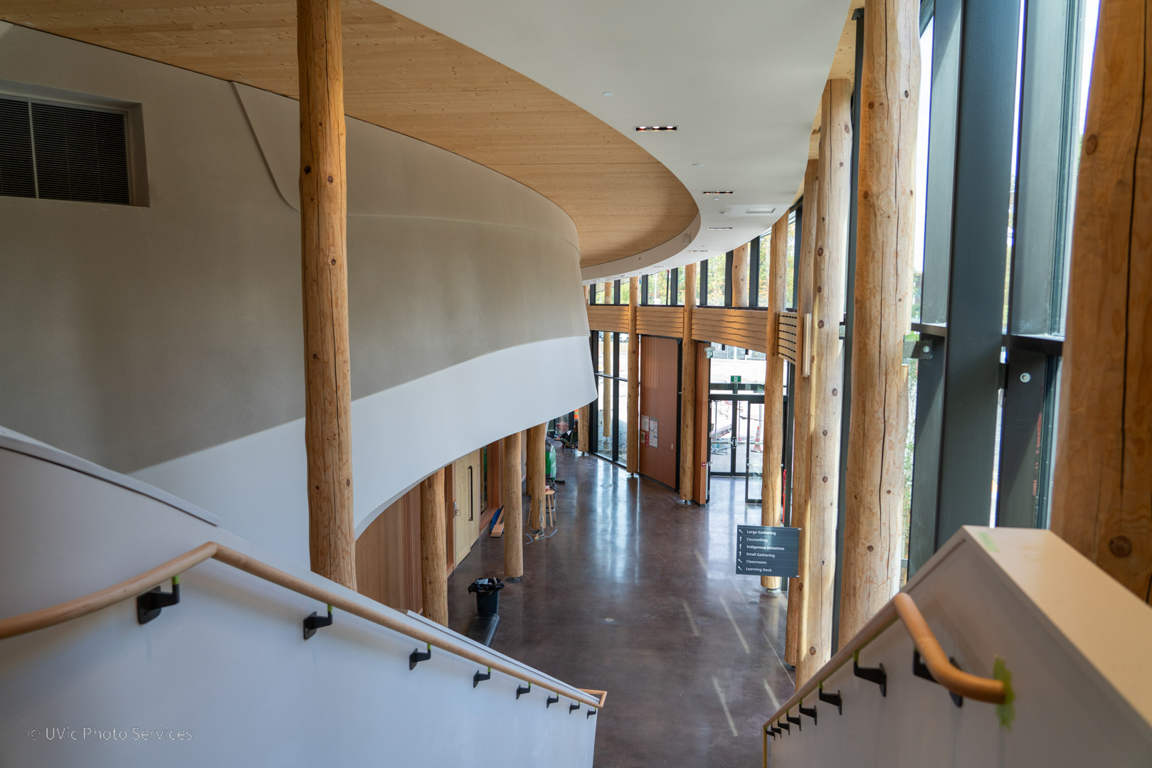 The Indigenous Law wing at the University of Victoria (UVic), completed in 2025, is a 29,000 sq ft mass timber addition to UVic’s Fraser Building. It houses Canada’s first degree program integrating Canadian Common Law and Indigenous legal traditions. Designed in collaboration with the local Indigenous groups, the new wing includes classrooms, faculty offices, meeting spaces, a creation space, a sky classroom, a 150-seat lecture hall, an Elder’s room, and large gathering areas with ventilation systems that support smudging ceremonies. The project also modernized the Fraser Building with updated flooring, ceilings, washrooms, common areas, and improved sprinkler and heating systems.