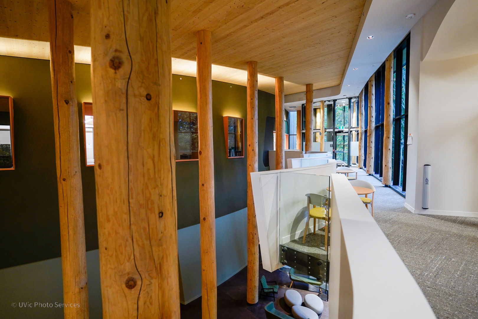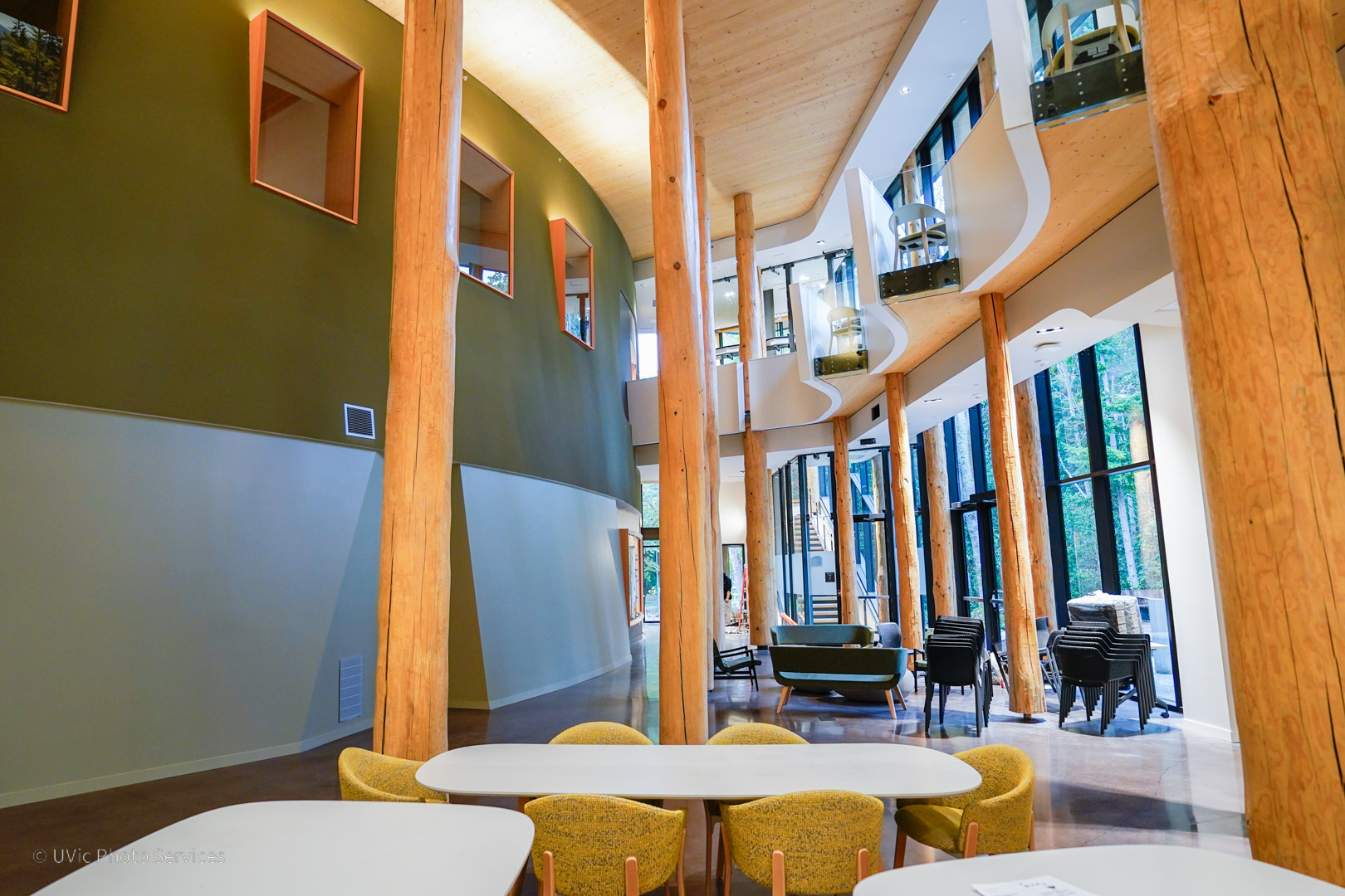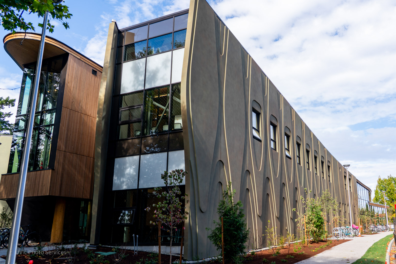 The Indigenous Law wing at the University of Victoria (UVic), completed in 2025, is a 29,000 sq ft mass timber addition to UVic’s Fraser Building. It houses Canada’s first degree program integrating Canadian Common Law and Indigenous legal traditions. Designed in collaboration with the local Indigenous groups, the new wing includes classrooms, faculty offices, meeting spaces, a creation space, a sky classroom, a 150-seat lecture hall, an Elder’s room, and large gathering areas with ventilation systems that support smudging ceremonies. The project also modernized the Fraser Building with updated flooring, ceilings, washrooms, common areas, and improved sprinkler and heating systems.